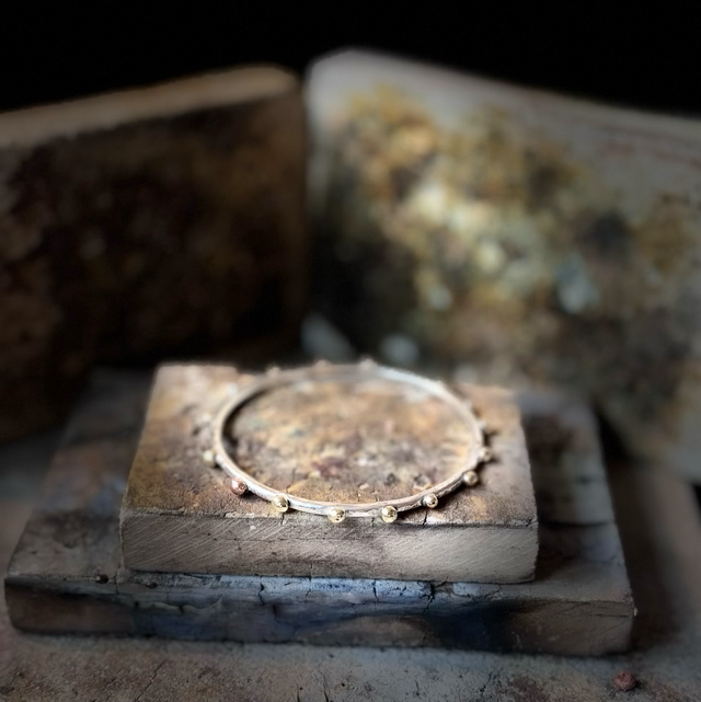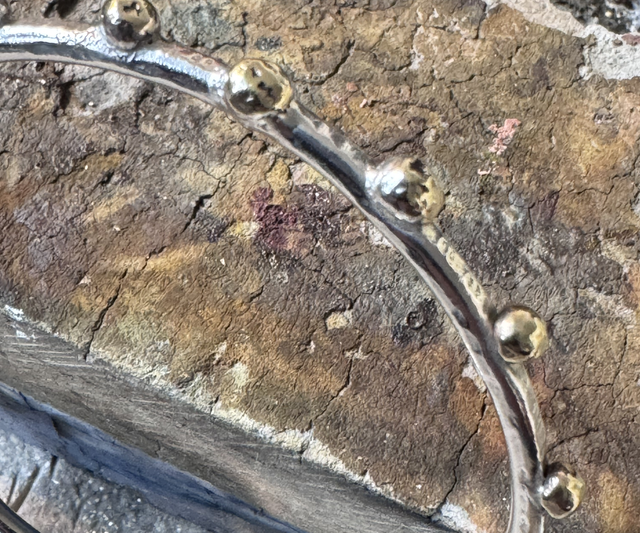 This bangle is lightly textured, it has 16 brass/copper and silver balls soldered to the outer side. This is a design incorporating Autumn colours, from fallen leaves in the woods.