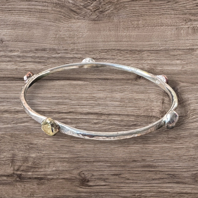 - Here is a sterling silver bangle that I made using recycled 3mm silver wire. Formed and lightly textured, handmade brass /Copper balls are then soldered to the outer surface, then it's put into a pickle to remove solder scale final part is to polish to a gorgeous mirror shine. This is a unique design inspired by the colours of Autumn. Mixed media jewellery is stunning as you're wearing silver but with little tones of copper and brass also. This can be worn daily and will last for years. A great gift for someone special or yourself.