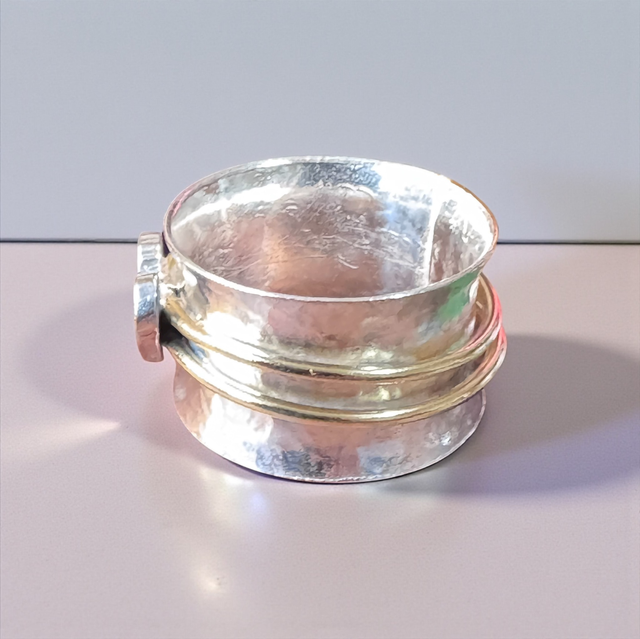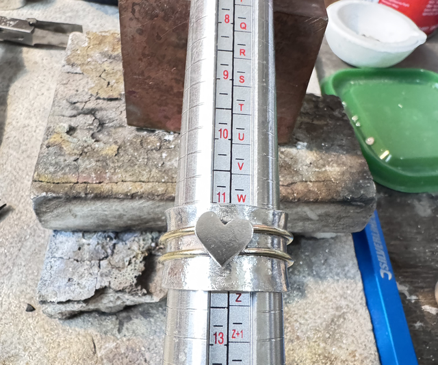 Here I have made a stunning wide band ring using sterling silver, the two bands around the ring are made with 14ct filled gold. The hand sawn heart is sterling silver. The ring is slightly bevelled at each end. This is a larger ring that can be worn daily or on any special occasion.