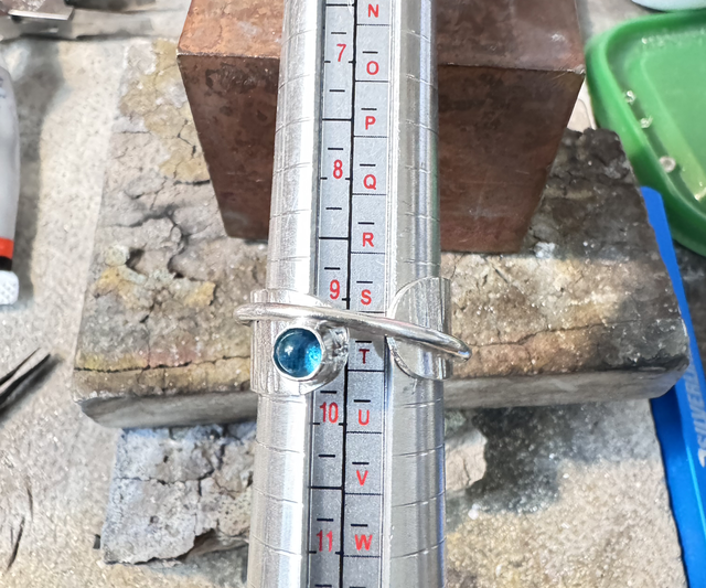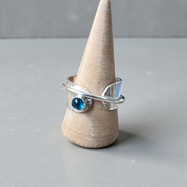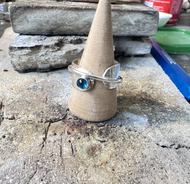 Here I have made a beautiful open band and Tourmaline ring using sterling silver. A simply textured ring, with a sterling silver band and a gorgeous blue tourmaline stone. This is representing a rock pool, the textured silver the rocks, the blue of the gemstone the water and the silver ring the shape of the pool. These can be pre ordered if you message me your ring size.